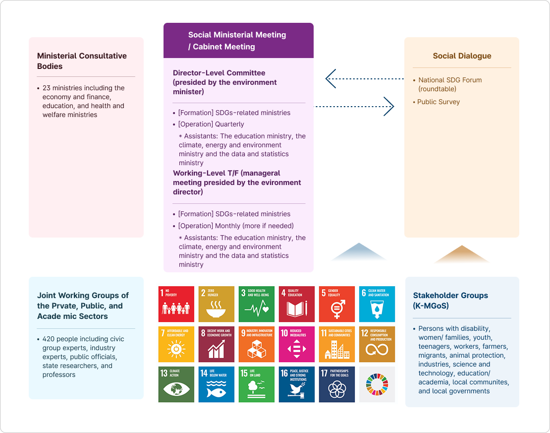 Throughout this process, the government served as a facilitator by providing forums for social dialogue and compiling the outcomes of discussions, while the actual goal-setting was led by joint public-private-academic working groups organized for each SDG.